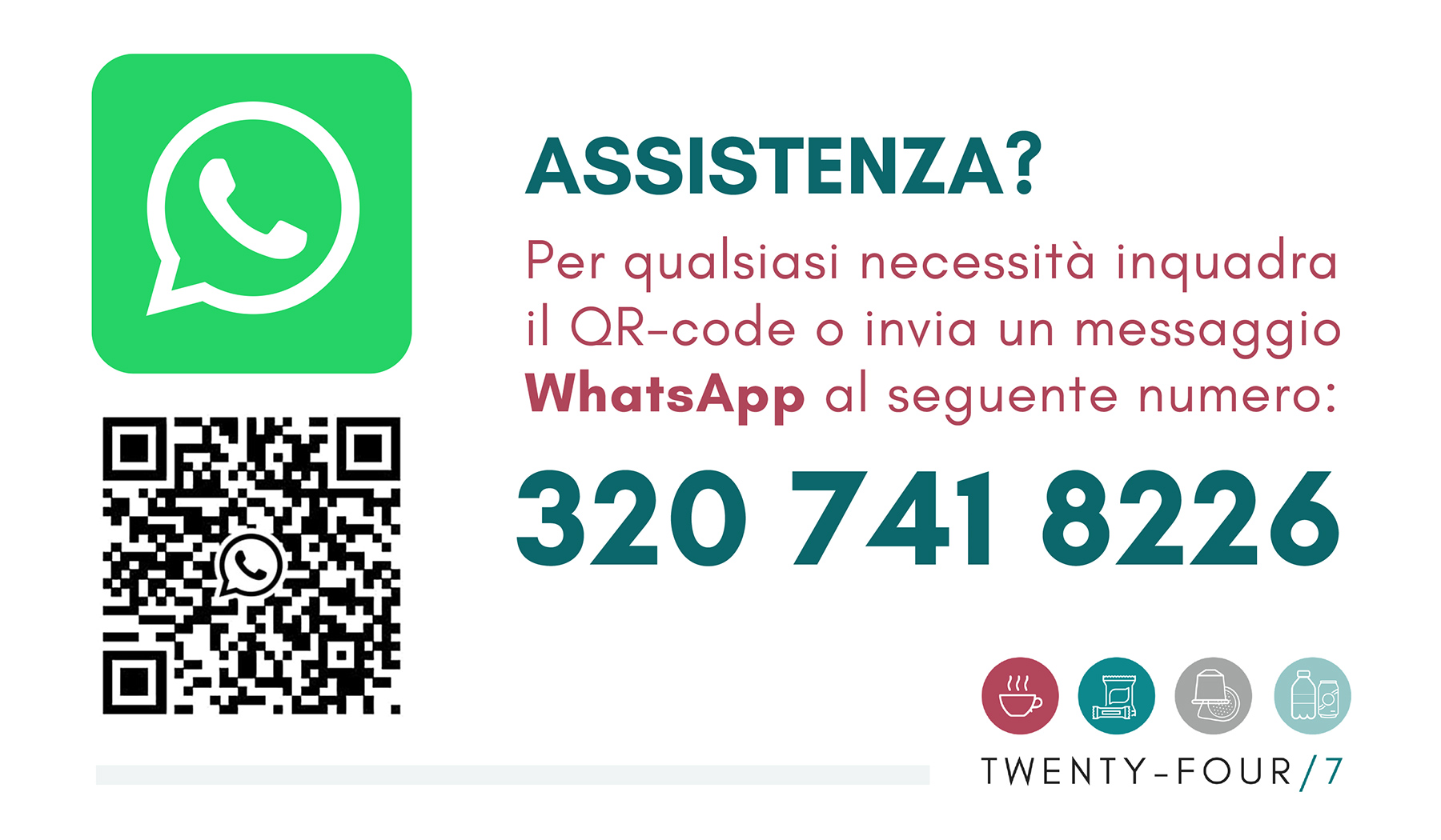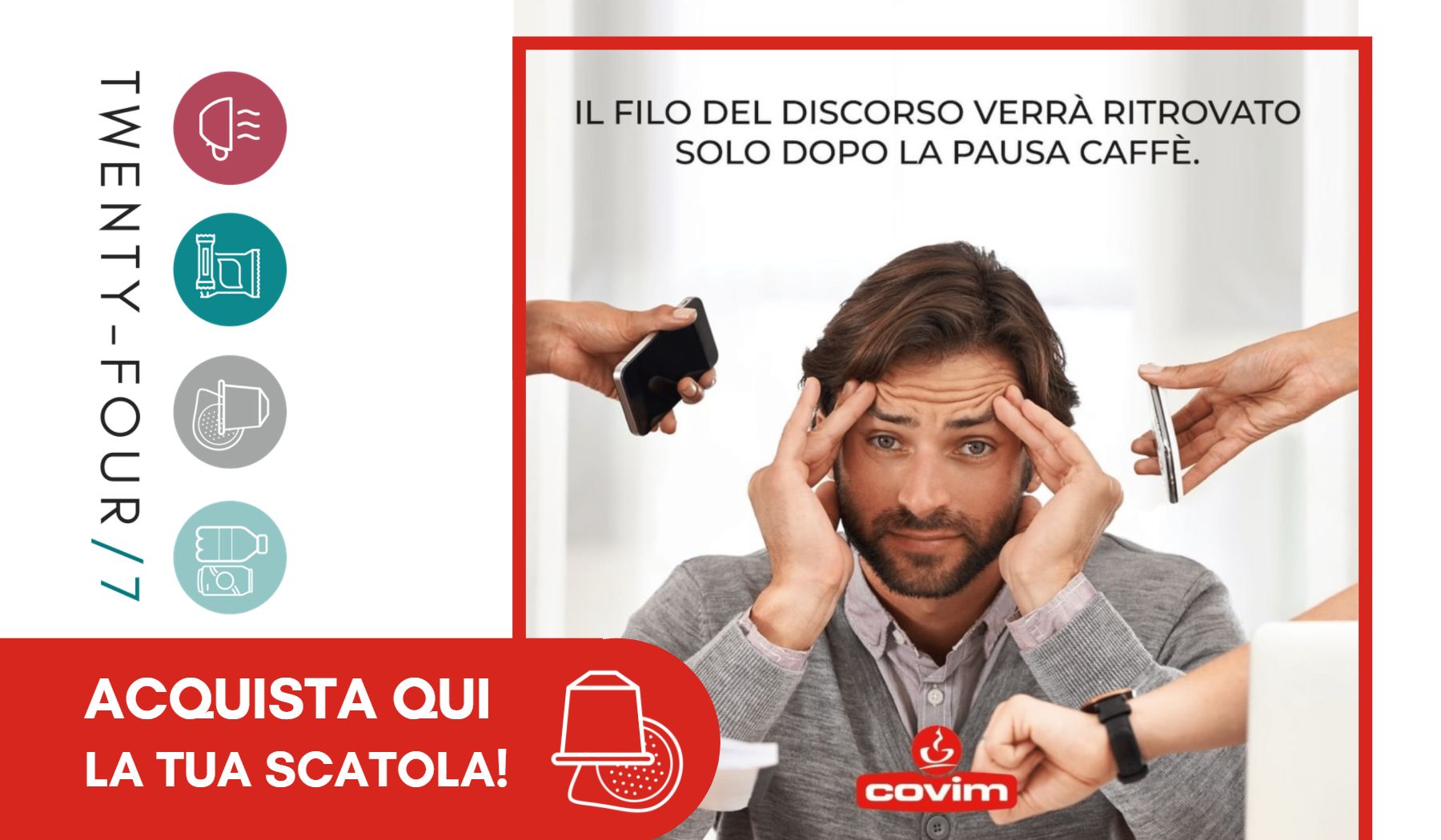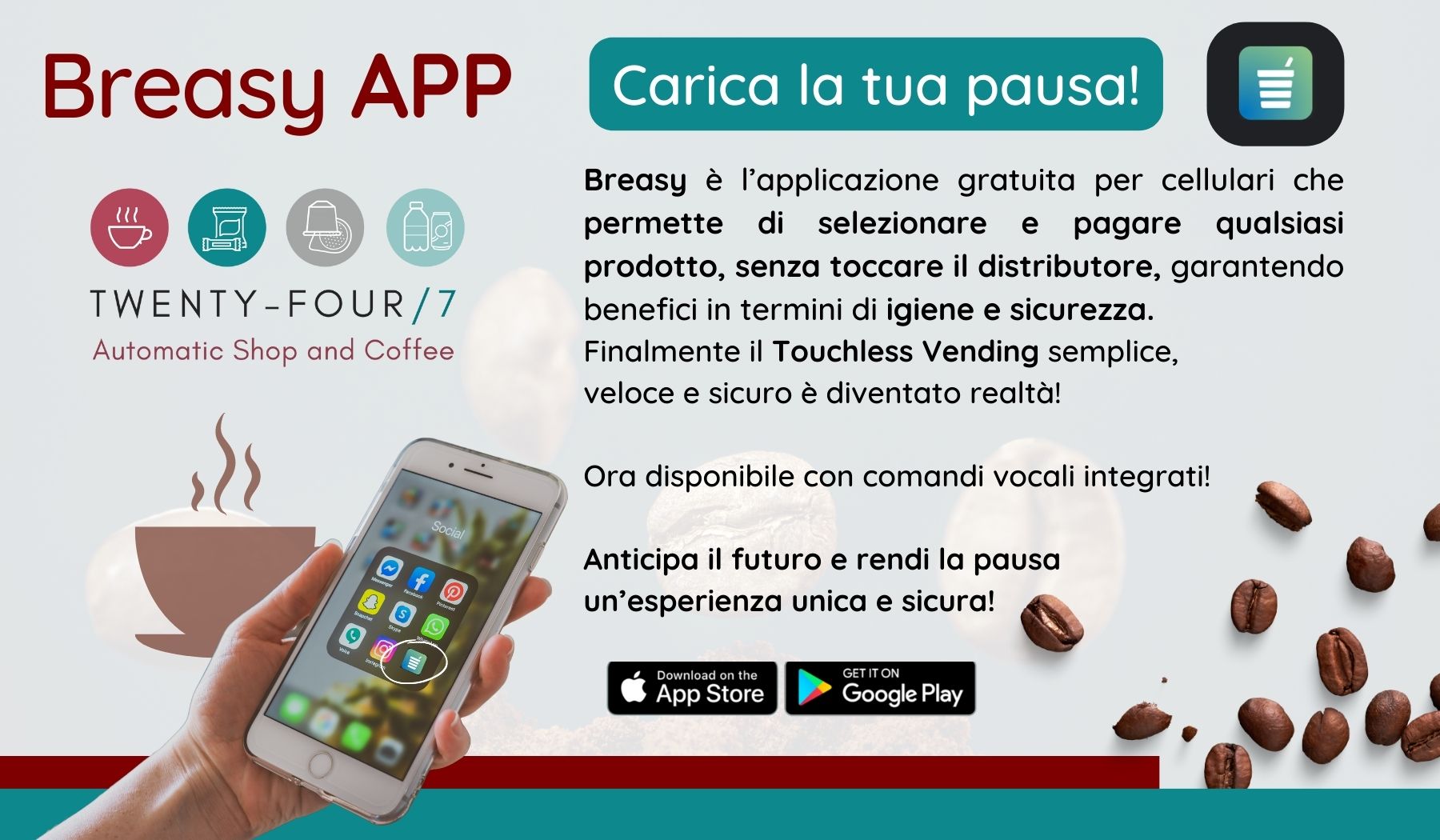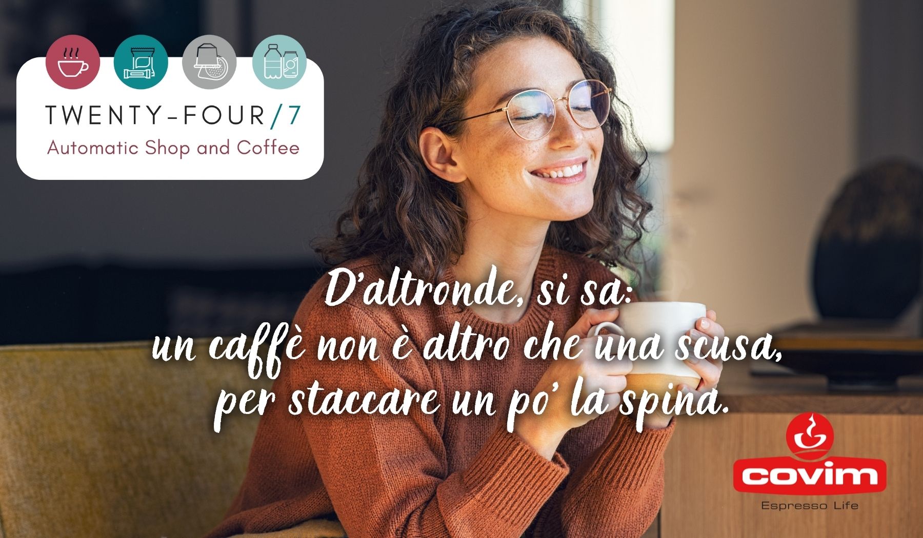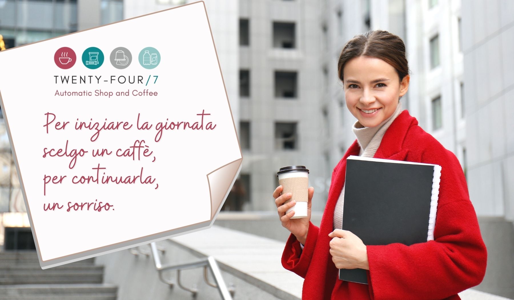 Twenty-four/7 è il tuo BAR: propone bevande calde, come il caffè di qualità Covim® macinato e preparato all'istante e le bevande al ginseng, latte macchiato, the, cioccolata calda, decaffeinato, cappuccino e tanto altro per un'ottima prima colazione o per la pausa durante la giornata.